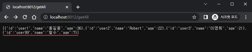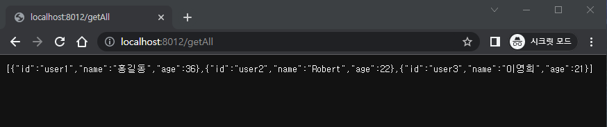 어느 브라우저로 테스트해도 상관없지만 나는 크롬으로 테스트했다. 파이어폭스를 이용하면 이보다 조금 더 깔끔하게 출력할 수 있고 위와 같은 다소 원시적인 방법보다 세련된 GUI로 테스트하고 싶다면 Postman을 추천한다.